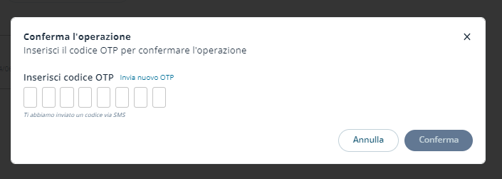 Per motivi di sicurezza, il sistema richiederà la convalida digitando un codice OTP che verrà ricevuto via SMS.