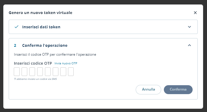 Per revocare il Token di interesse, dopo aver cliccato sul tasto Revoca, si riceverà via SMS un Codice OTP per confermare la procedura.