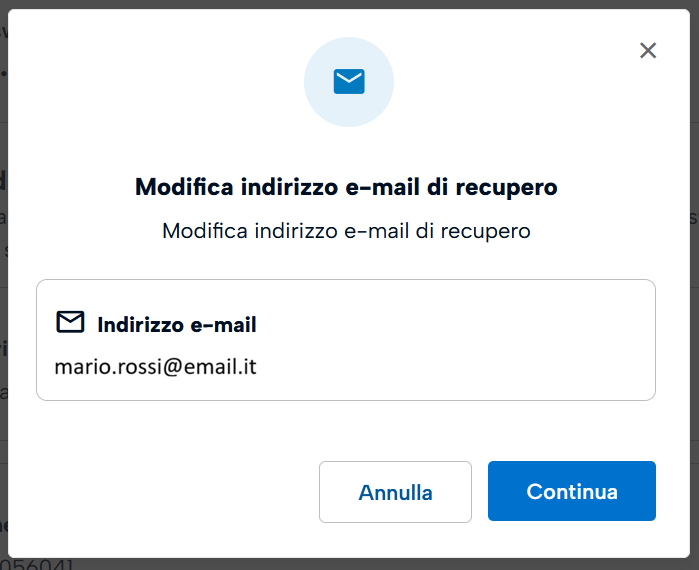 Inserisci il nuovo indirizzo email di recupero e clicca su Continua.