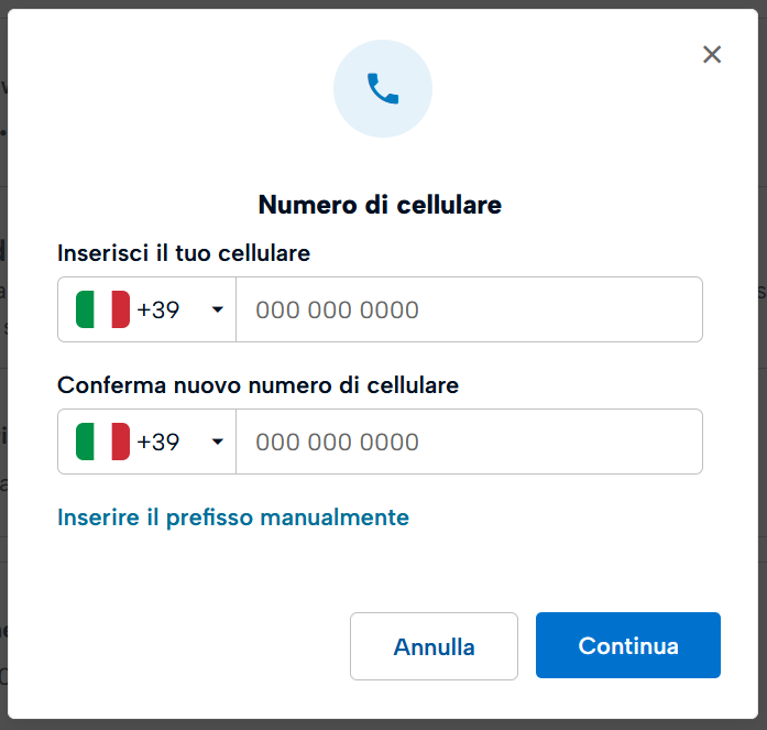 Inserisci il nuovo numero di cellulare di recupero e conferma l'operazione cliccando su Continua.