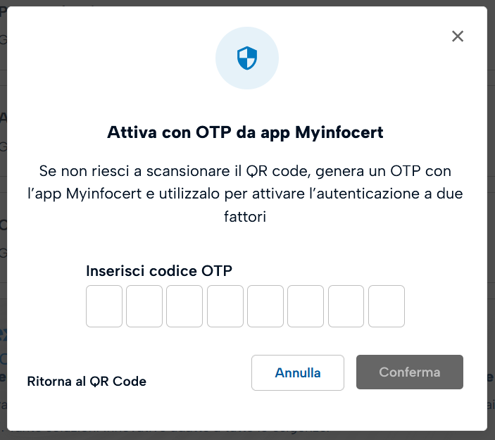 Per motivi di sicurezza, il sistema richiederà una convalida attraverso la digitazione di un codice OTP che sarà ricevuto via SMS.