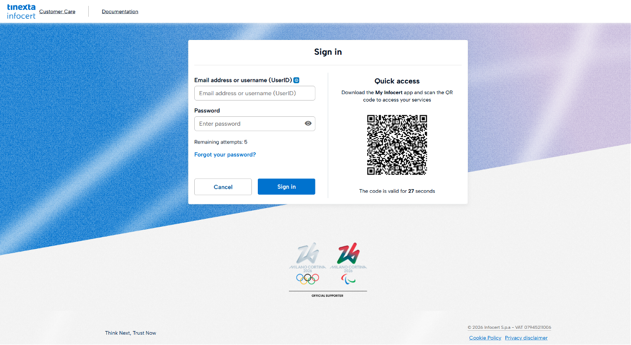 After downloading and configuring the My Infocert app with your Signature credentials, scan the QR code that appears on the screen using the My Infocert app's functionality.
