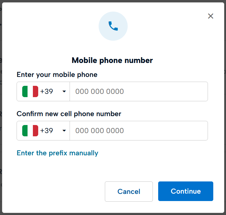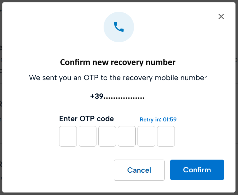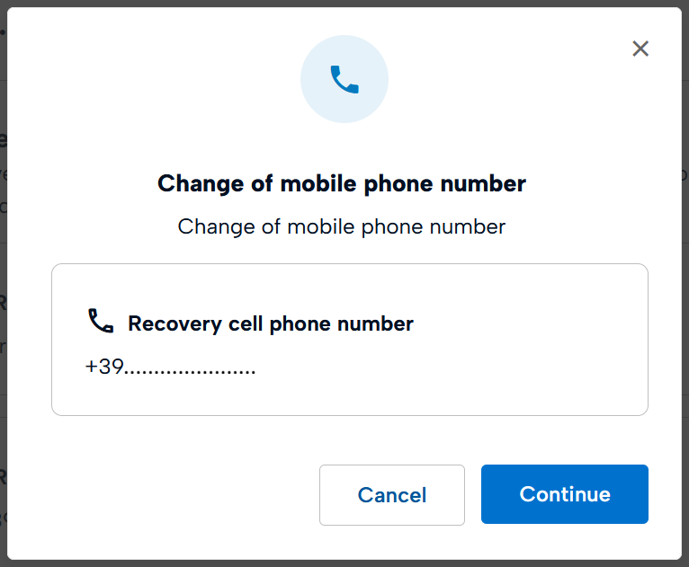 Enter your new recovery mobile number and confirm the operation by clicking Continue.