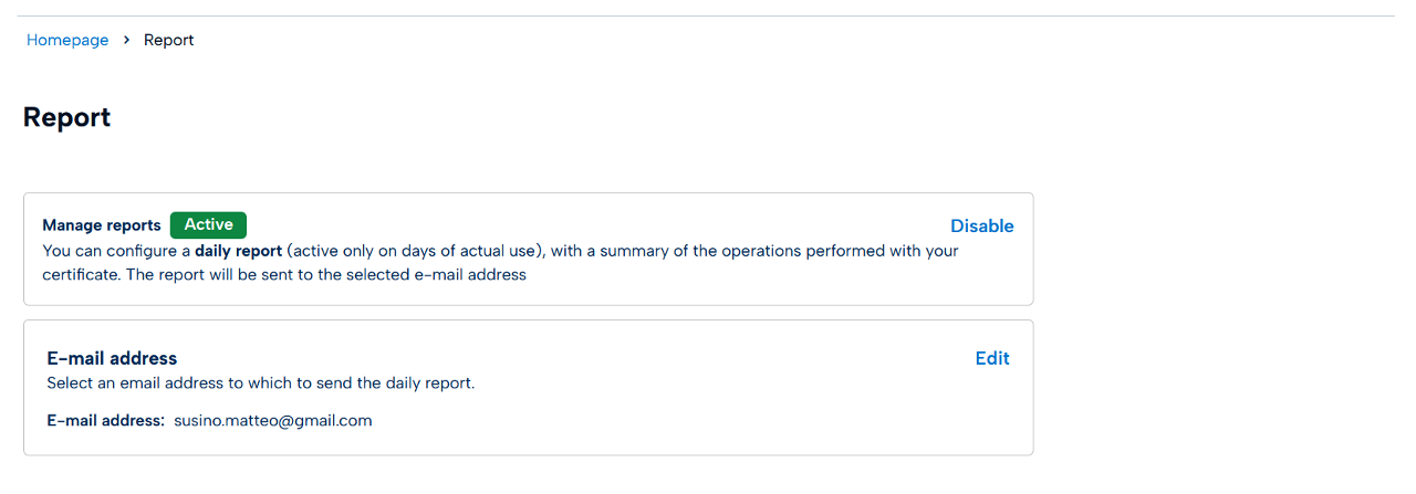 In the "Report" section, you can set up a daily report with a summary of the operations performed on the certificate in use.
