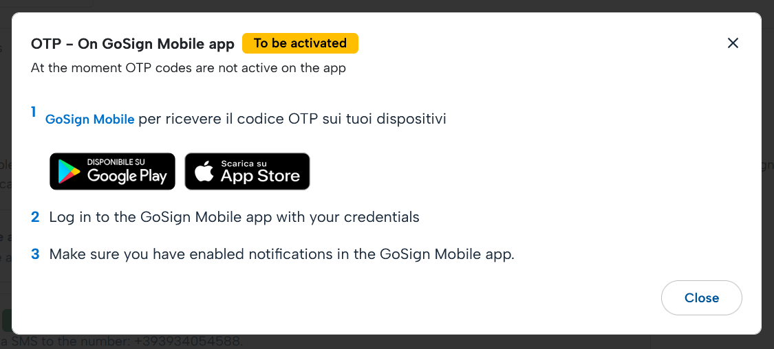 Choosing the option "OTP - On GoSign Mobile App" will display a pop-up inviting you to download the GoSign Mobile app on your smartphone to link your signature account and receive OTP codes.