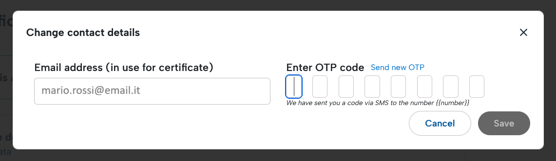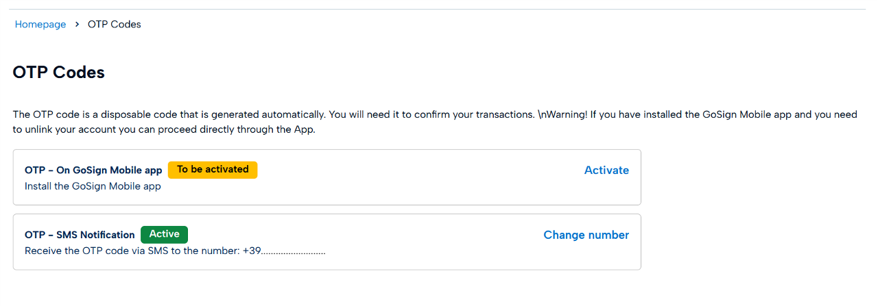 For security reasons, the system will request validation by entering an OTP code that will be received via SMS.