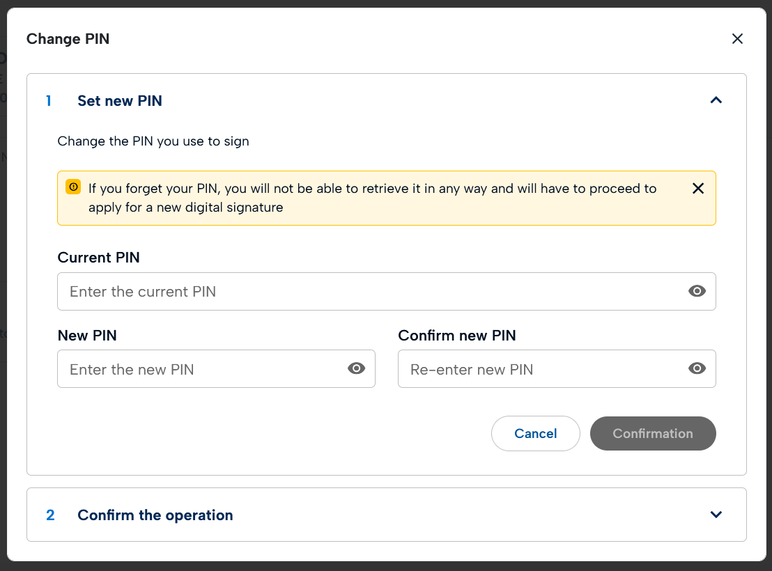 After entering the current PIN and the new one, which must be confirmed, proceed with a click on the Confirmation button.