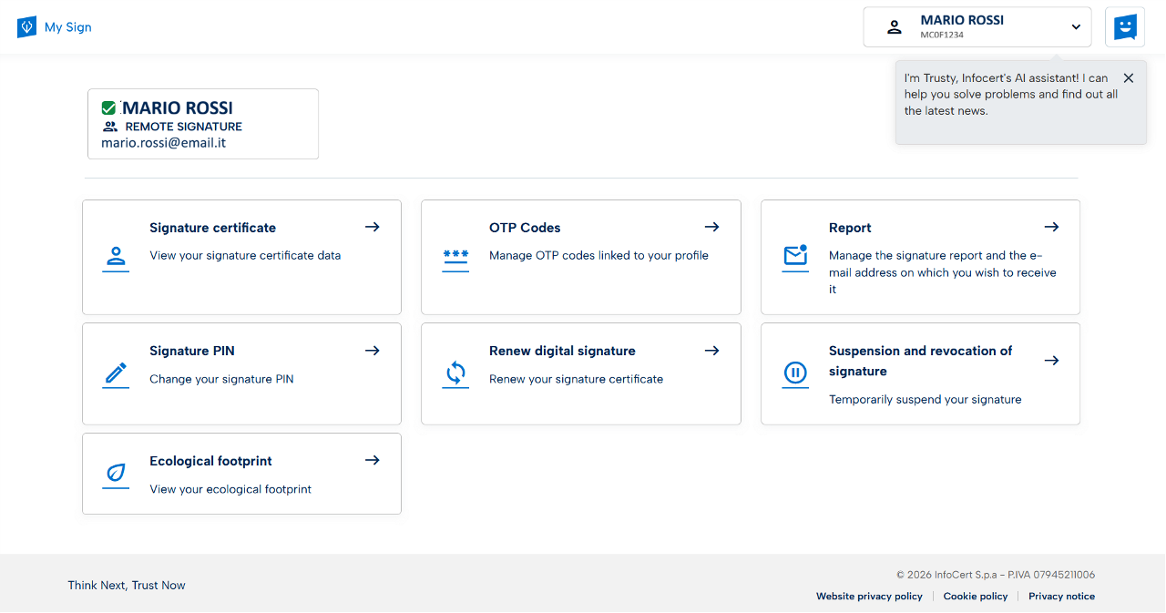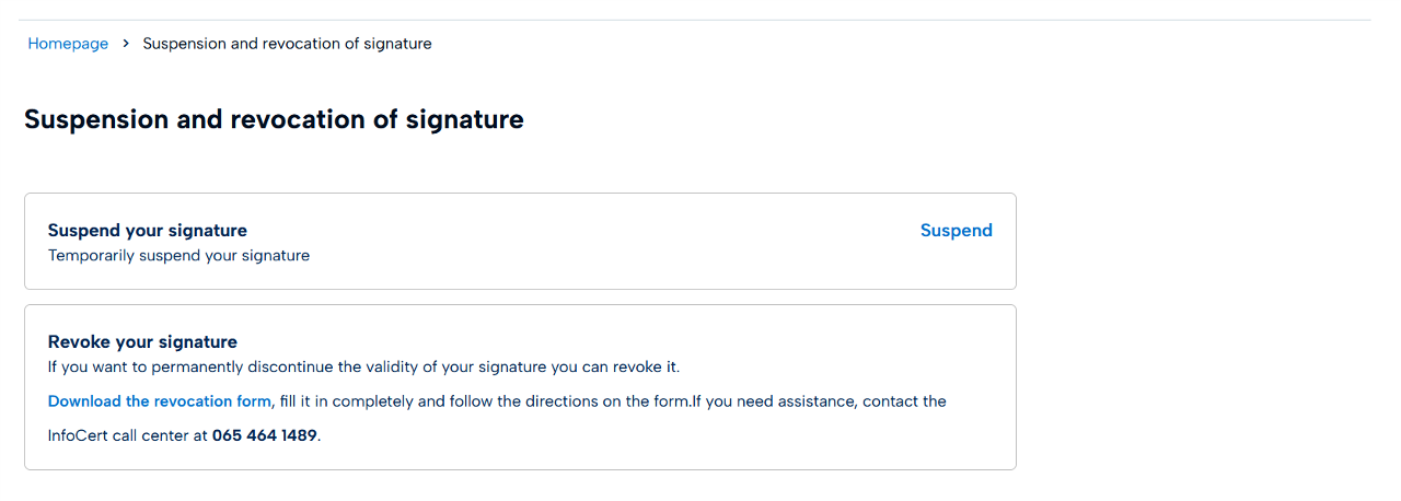 In this section you can temporarily suspend your signature or revoke it by permanently interrupting its validity.