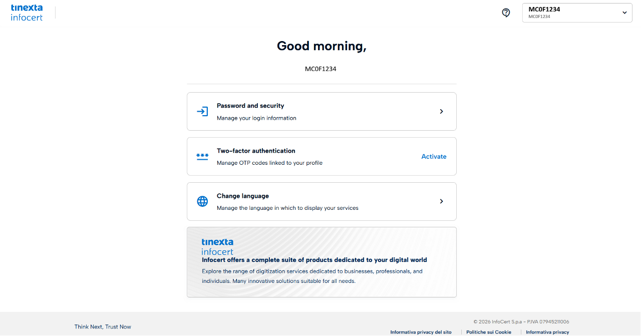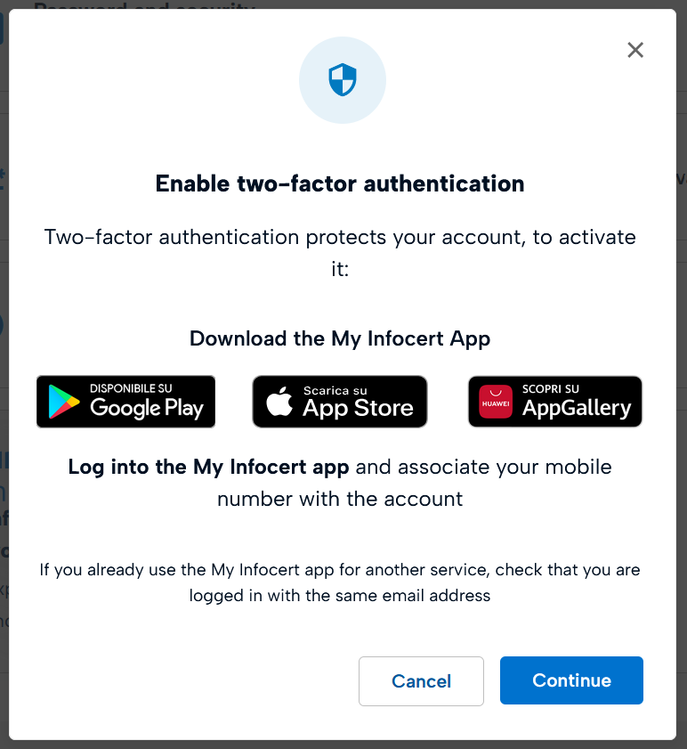To activate two-factor authentication, you must download the free My Infocert app and complete the setup by entering your signature credentials.