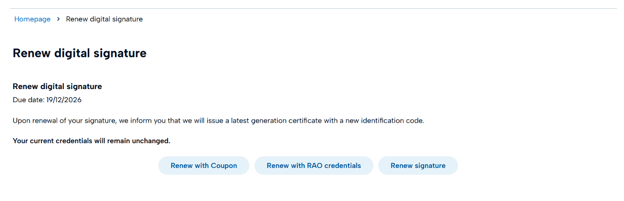 In the Renew Digital Signature section, you can view the expiration date of your certificate and renew.