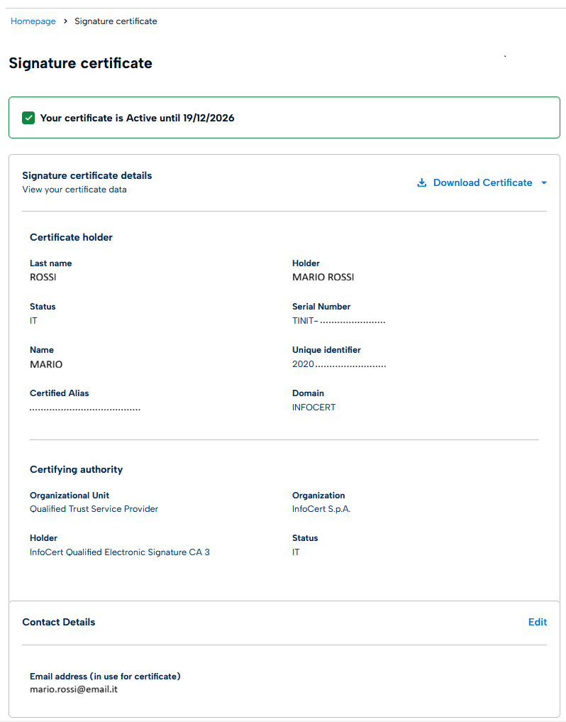 In this section you will find general information about the certificate: status, activation date, unique identifier number.