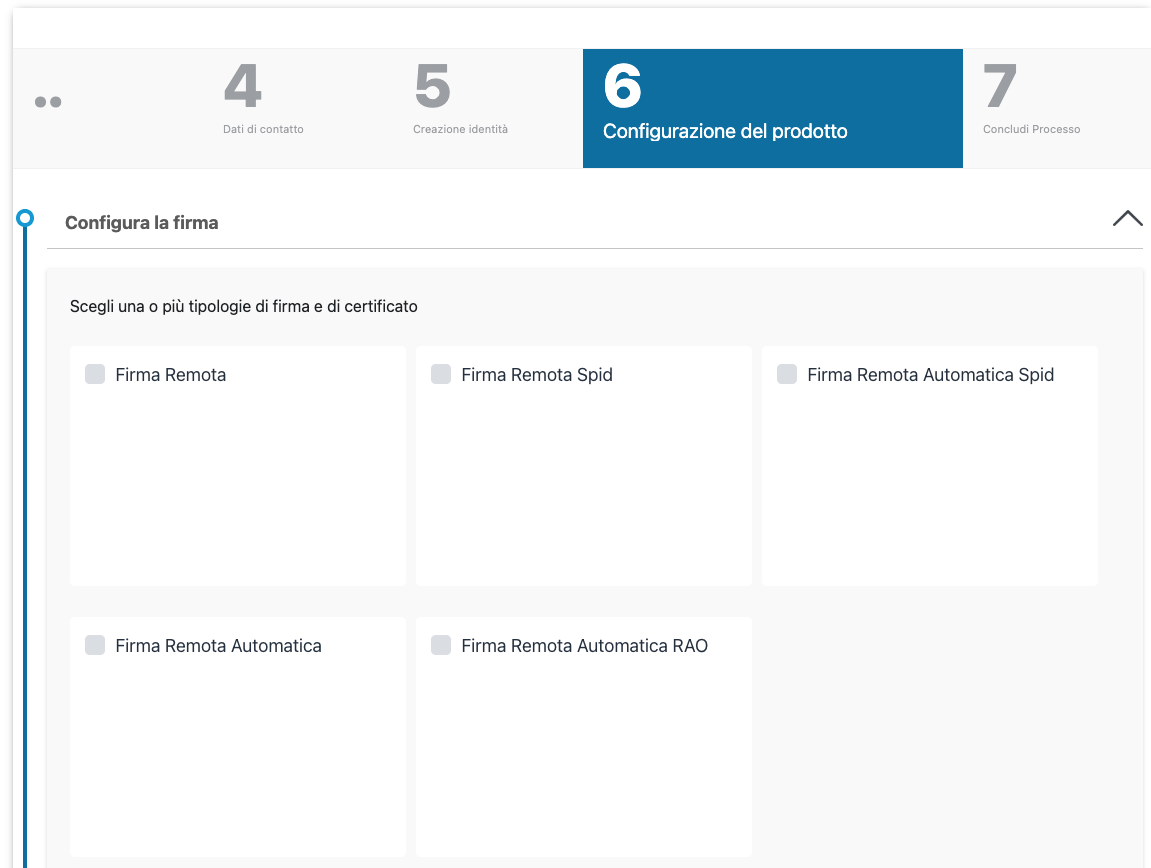 Il processo di richiesta prodotto è diviso in 8 step e si biforca inizialmente in base al tipo di riconoscimento dell'utente finale che viene selezionato tra quelli a disposizione:
