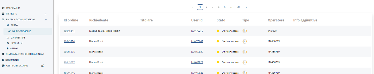 Il RAO può direttamente continuare il processo di emissione a valle del riconoscimento, oppure riprenderlo in un secondo momento nel menù laterale in Ricerca e consultazioni alla sezione Da emettere, nella quale l'operatore può trovare tutte le richieste effettuate che devono essere ancora emesse: