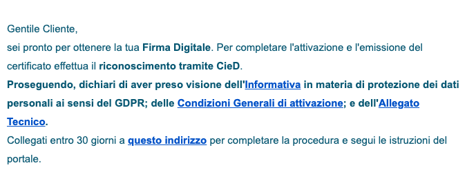Il cliente ha ricevuto una e-mail alla casella indicata contenente il link da cliccare per iniziare il processo di riconoscimento CIE:
