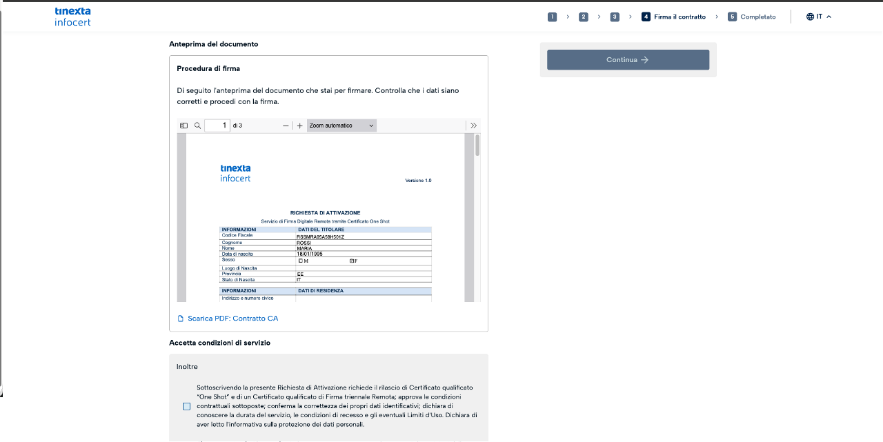 Selezionando le condizioni indicate, il soggetto può proseguire e firmare il contratto inserendo l'OTP ricevuto.